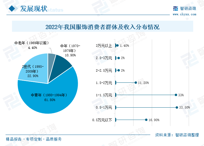 據艾媒咨詢調研數據顯示,中國服飾行業消費者主要由中青年與“Z世代”人群組成,合計共占84.8%;消費者收入主要集中在5000-10000元與10001-15000元區間,兩部分占到消費人群的66.5%。在消費升級的背景下,年輕人逐漸成為消費市場的主力,新一代消費者不再局限于產品的功能價值,更追求產品的精神價值和使用體驗,在此類消費趨勢的拉動下,家居服飾市場的消費潛力和動力得到有效激發,推動了家居服飾產業升級。