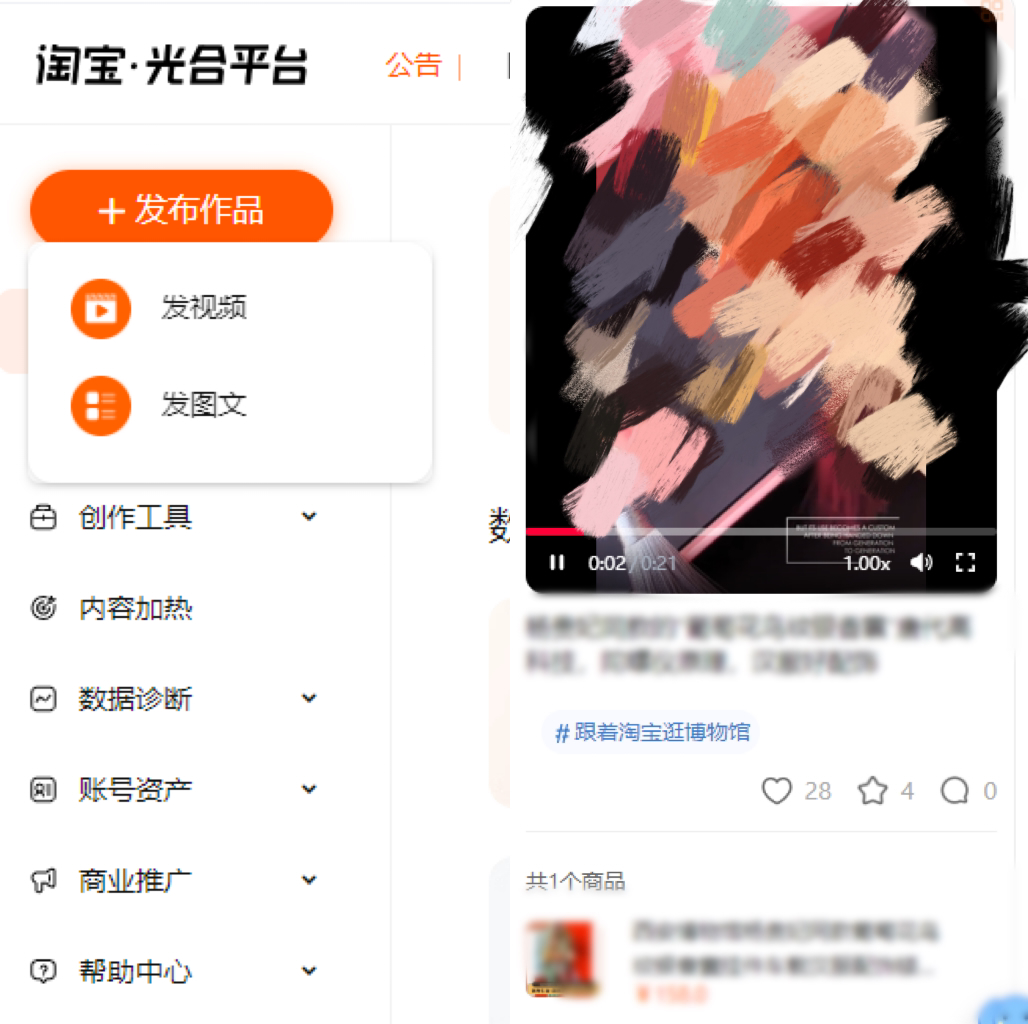 第三步發(fā)布光合平臺:制作完成后的視頻來發(fā)布光合平臺,選擇發(fā)視頻(視頻滿足條件:mp4、mkv、mov格式上傳,720p 以上,文件最大1.5G,時長15分鐘以下)。編輯其產(chǎn)品相關(guān)的標(biāo)題和文案,添加當(dāng)時的熱點話題“跟著淘寶逛博物館”,同時添加對應(yīng)產(chǎn)品的跳轉(zhuǎn)。每周進行發(fā)布4-5篇內(nèi)容,來持續(xù)曝光產(chǎn)品獲得對應(yīng)流量,開始店鋪幾乎沒有內(nèi)容流量,發(fā)布引導(dǎo)訪客數(shù)增加2w+。